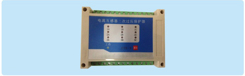 組合式電流互感器二次過電壓保護(hù)器主要用于各種CT二次側(cè)的異常過電壓保護(hù)。保護(hù)器固接于CT二次繞組兩端,正常運(yùn)行時(shí)泄漏電流小,呈高阻狀態(tài);當(dāng)CT二次回路開路或一次繞組出現(xiàn)異常過流時(shí),二次繞組產(chǎn)生的電壓遠(yuǎn)遠(yuǎn)高于正常運(yùn)行電壓,些時(shí)保護(hù)器迅速動(dòng)作而短路,面板上顯示故障的部位,并有無源接點(diǎn)信號(hào)輸出。故障排除后,按手動(dòng)復(fù)位按鈕,電路恢復(fù)原狀后又重新設(shè)入正常運(yùn)行工作。